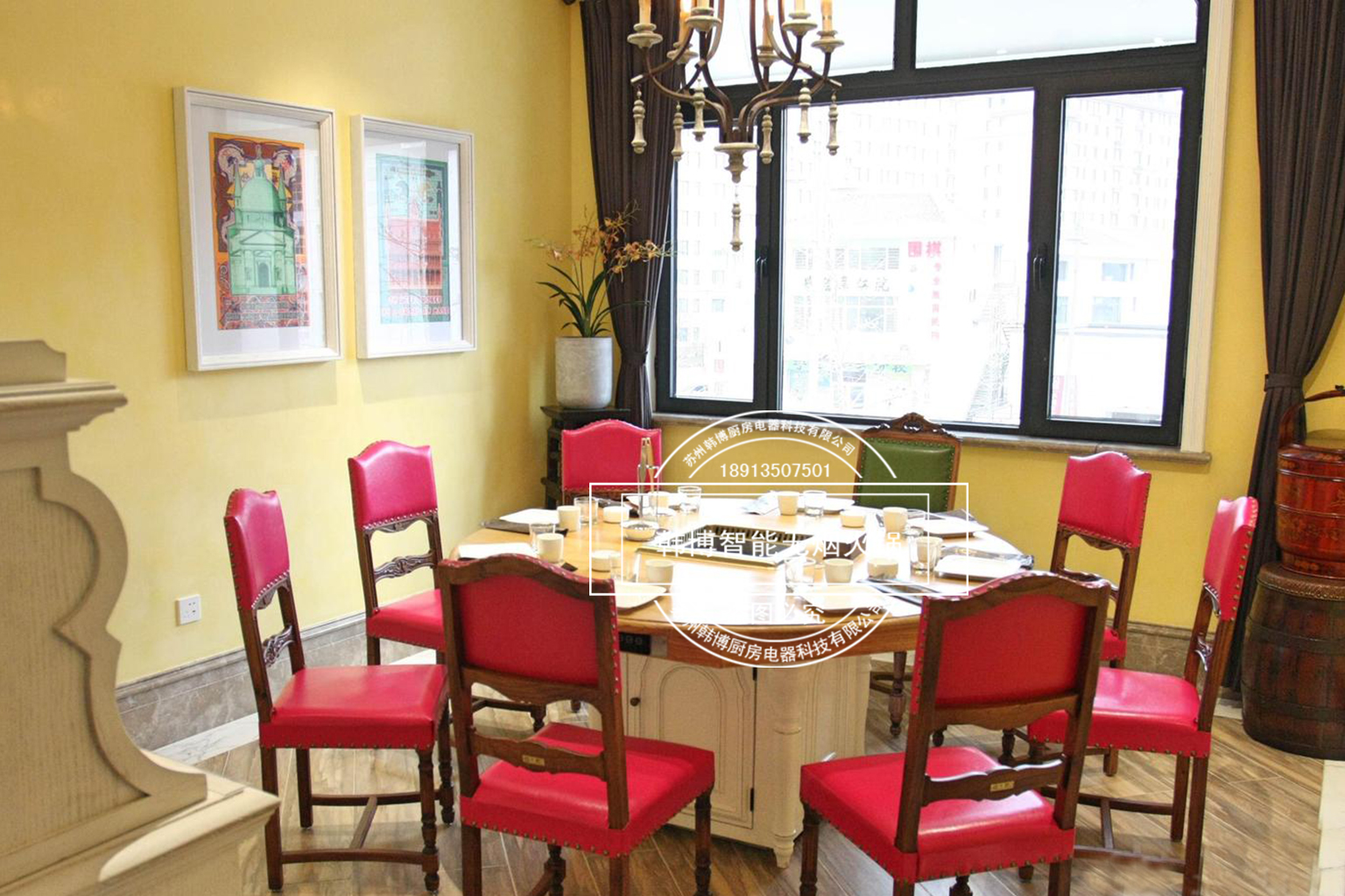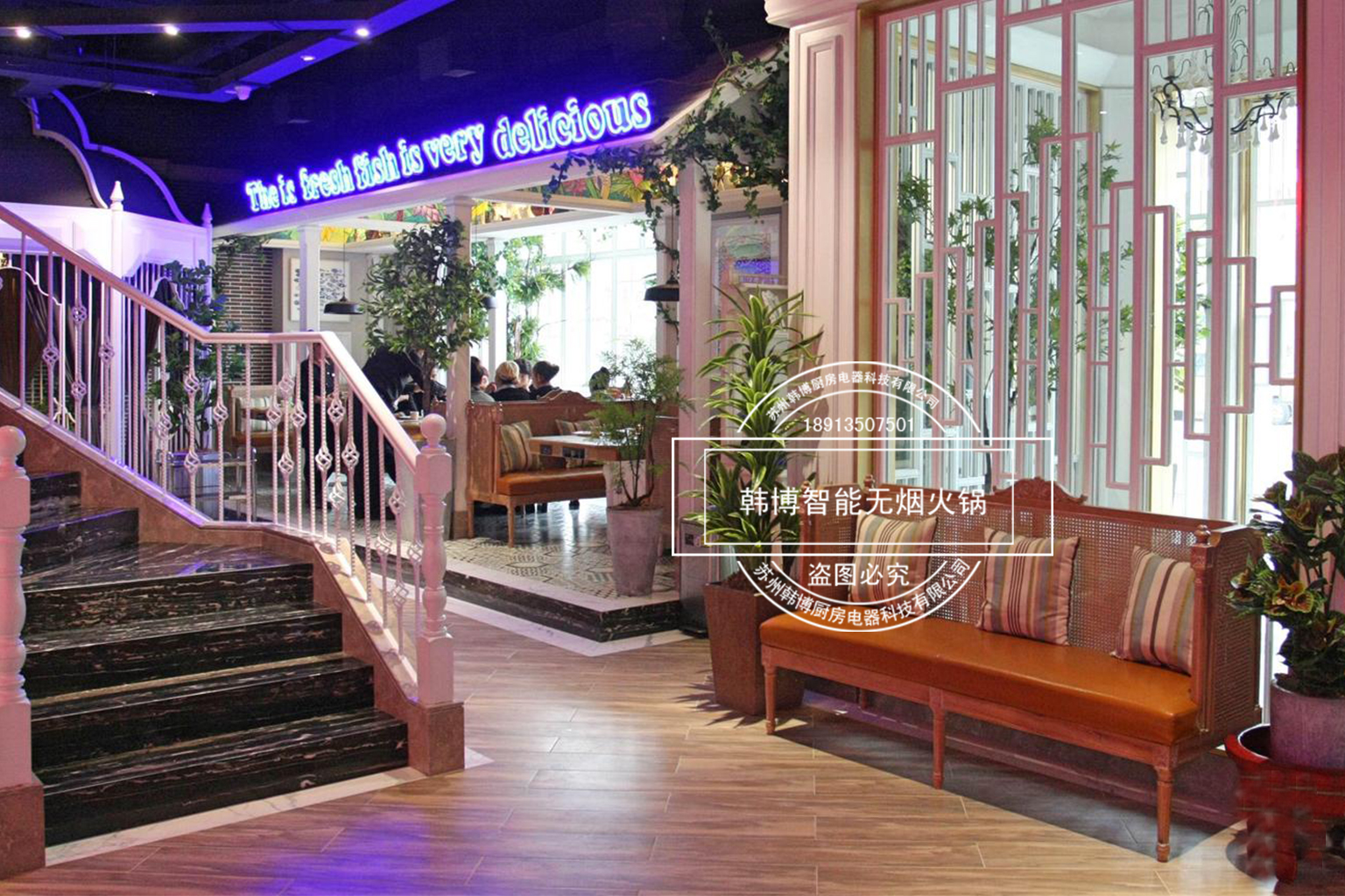 店內的裝修也是很時尚,這里到處都是能讓人賞心悅目的裝飾,特別溫馨浪漫,精心的布置、但細節更動人!因為在這你看不到油煙四處升騰的現象,這一切都是由于使用了韓博智能無煙火鍋設備油煙凈化系統讓油煙魔力般的往下吸走,吸油煙率高達99%,從而營造了一個溫馨時尚的就餐環境。