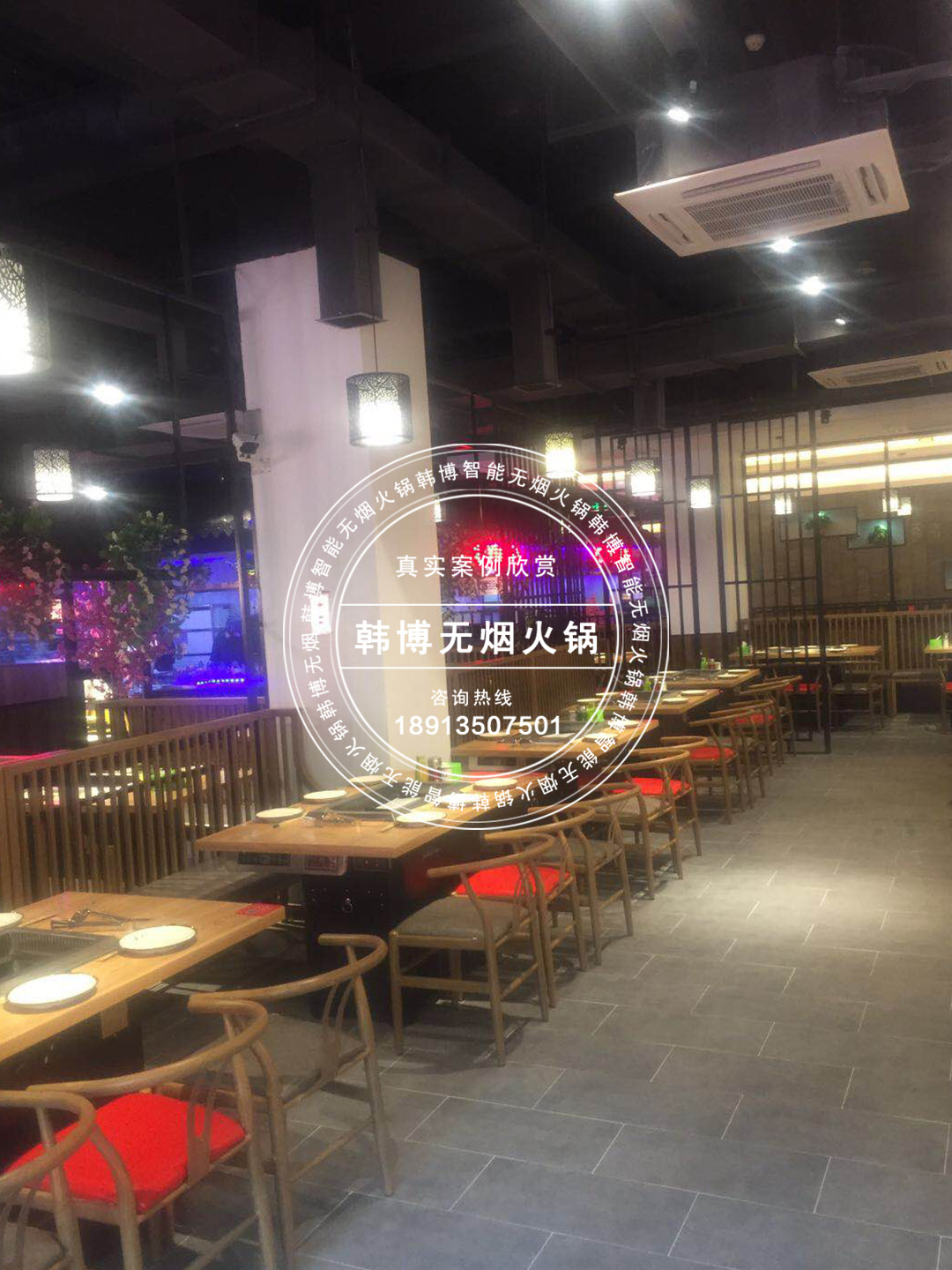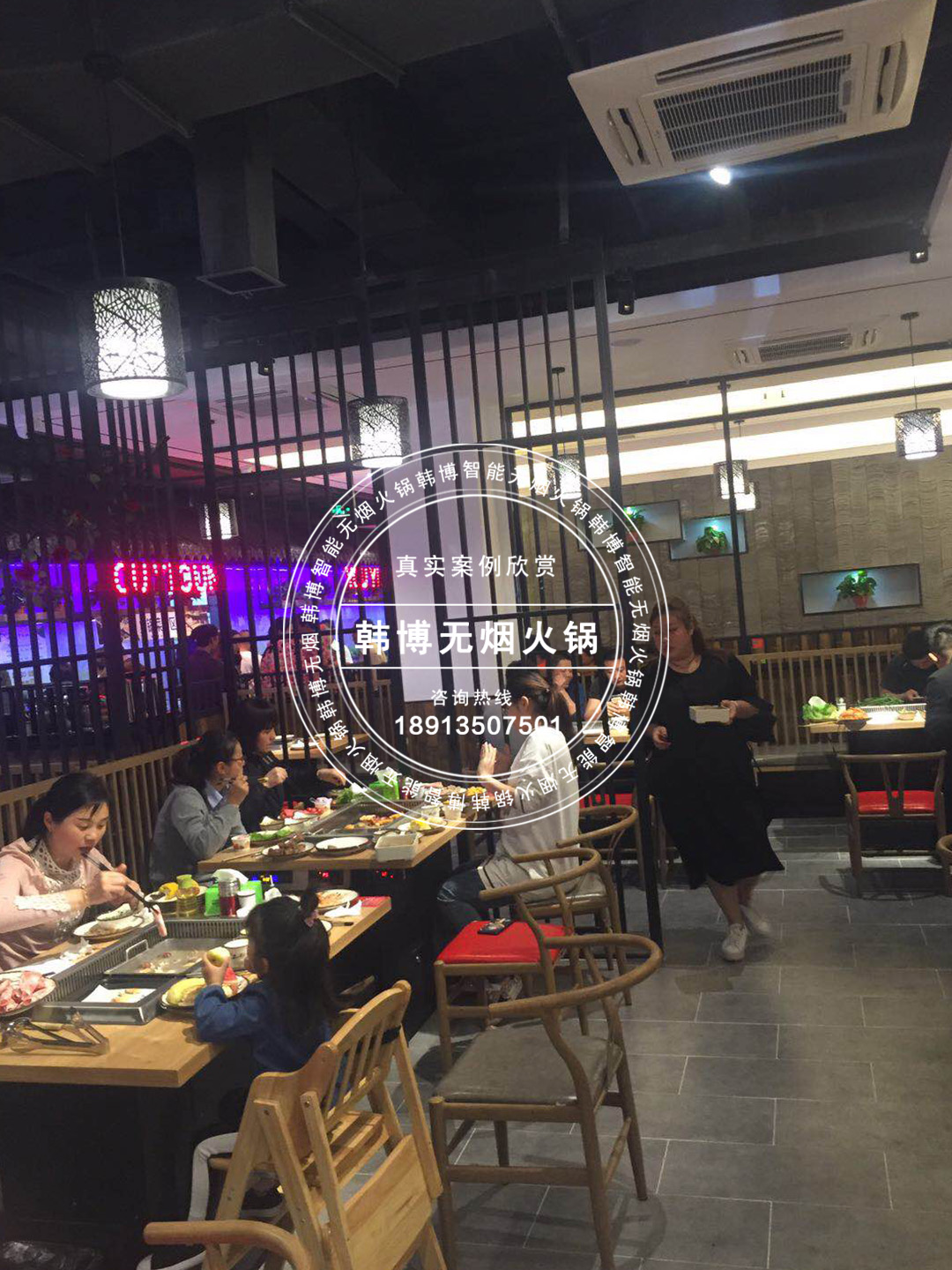 店里進來超寬敞,而且裝修十分古色古香在昏黃的燈光襯托下,整個餐廳顯得分外古樸典雅,與傳統火鍋燒烤店不同的是,這里的桌子不一般,底下都安裝了韓博油煙凈化系統,微電腦觸摸屏設計,油煙凈化效果更好。